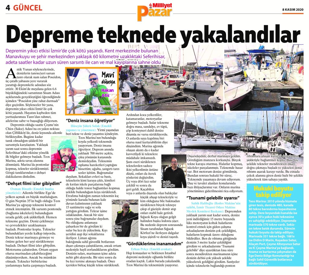 Teos Marina: 2010 yılında hizmete giren tesis, denizde 480, karada 80 tekne barındırma kapasitesine sahip. Dere boyundaki kanalda ise ayrıca 30’a yakın hobi teknesine ev sahipliği edebiliyor. Depremde marinada 570 tekne vardı. Sekiz-on tekne batık durumda. Sürecin hukuki boyutu da takip ediliyor. Marinada 331 tekne bağlı. 166’sı ise Didim D Marin, Kuşadası Setur, Alaçatı Port, Çeşme Altınyunus Setur ve IC Çeşme Marina’ya bağlandı. Arama ve kurtarma çalışmaları da Ege Deniz Bölge Komutanlığı’na bağlı Sahil Güvenlik botlarınca sürdürülüyor.