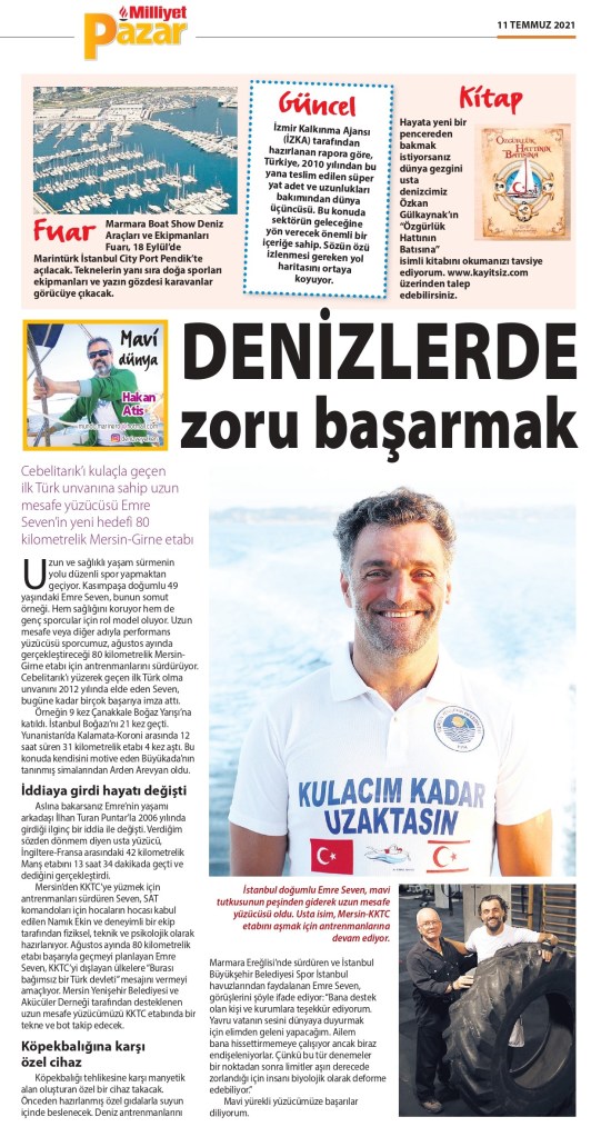Mersin’den KKTC’ye yüzmek için antrenmanları sürdüren Seven, SAT komandoları için hocaların hocası kabul edilen Namık Ekin ve deneyimli bir ekip tarafından fiziksel, teknik ve psikolojik olarak hazırlanıyor. Ağustos ayında 80 kilometrelik etabı başarıyla geçmeyi planlayan Emre Seven, KKTC’yi dışlayan ülkelere “Burası bağımsız bir Türk devleti” mesajını vermeyi amaçlıyor. Mersin Yenişehir Belediyesi ve Akücüler Derneği tarafından desteklenen uzun mesafe yüzücümüzü KKTC etabında bir tekne ve bot takip edecek.