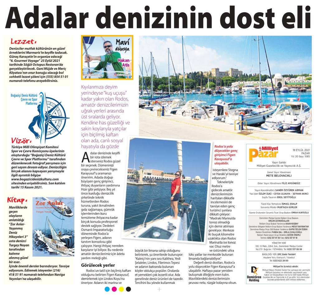 Değerli deniz dostları, Rodos’a yolu düşecekler Figen Karayusuf’a ulaşabilir. Haftaya pazar yeniden buluşmak dileğiyle esen kalın. Maviliklerdeki denizcilerimizin pruvası neta, rüzgâr kolayına olsun.