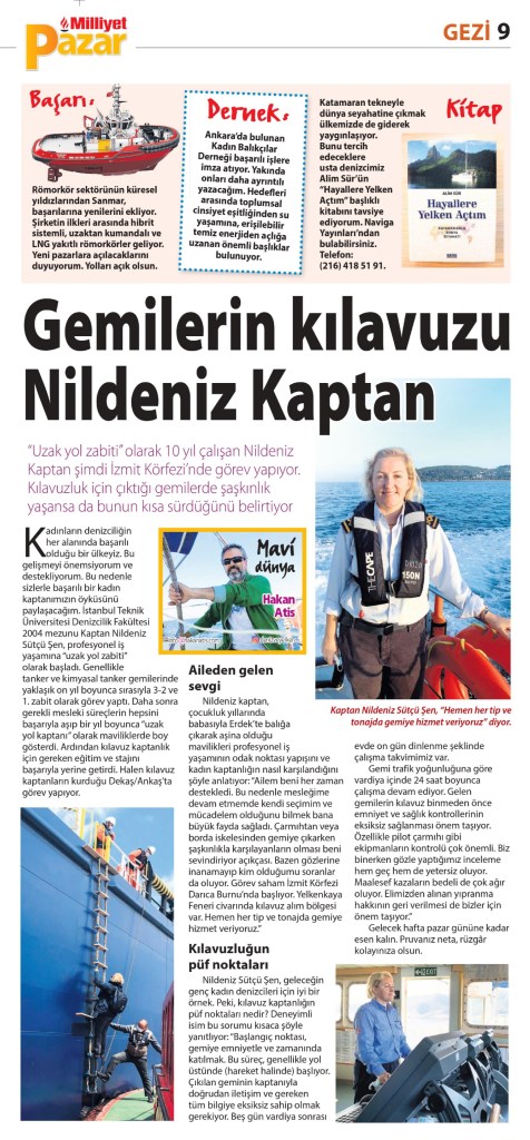 Kadınların denizciliğin her alanında başarılı olduğu bir ülkeyiz. Bu gelişmeyi önemsiyorum ve destekliyorum. Bu nedenle sizlerle başarılı bir kadın kaptanımızın öyküsünü paylaşacağım. İstanbul Teknik Üniversitesi Denizcilik Fakültesi 2004 mezunu Kaptan Nildeniz Sütçü Şen, profesyonel iş yaşamına “uzak yol zabiti” olarak başladı.