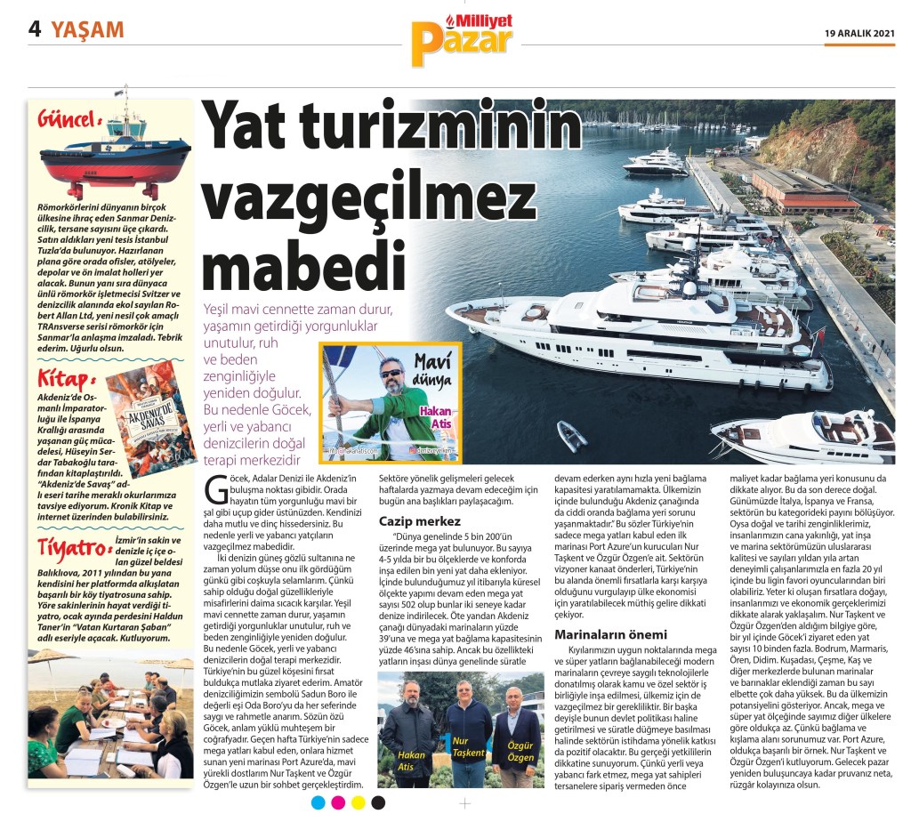 Bu nedenle Göcek, yerli ve yabancı denizcilerin doğal terapi merkezidir. Türkiye’nin bu güzel köşesini fırsat buldukça mutlaka ziyaret ederim. Amatör denizciliğimizin sembolü Sadun Boro ile değerli eşi Oda Boro’yu da her seferinde saygı ve rahmetle anarım. Sözün özü Göcek, anlam yüklü muhteşem bir coğrafyadır. Geçtiğimiz hafta Türkiye’nin sadece mega yatları kabul eden, onlara hizmet sunan yeni marinası Port Azure’da mavi yürekli dostlarım Nur Taşkent ve Özgür Özgen’le uzun bir sohbet gerçekleştirdim. Sektöre yönelik gelişmeleri gelecek haftalarda yazmaya devam edeceğim için bugün ana başlıkları paylaşacağım.