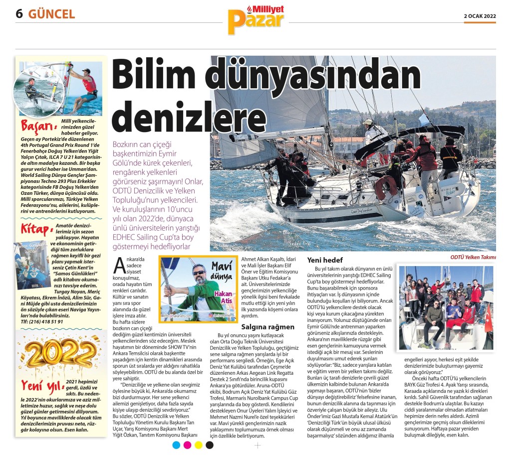 ‘’Denizciliğe ve yelkene olan sevgimiz öylesine büyük ki, Ankara’da okuyor olmamız bizi durdurmuyor. Her sene yelkenci ailemizi genişletiyor, daha fazla sayıda kişiye ulaşıp denizciliği sevdiriyoruz.’’ Bu sözler ODTÜ Denizcilik ve Yelken Topluluğu Yönetim Kurulu Başkanı Tan Uçar, Yarış Komisyonu Başkanı Mert Yiğit Özkan, Tanıtım Komisyonu Başkanı Ahmet Alkan Kaşaltı, İdari ve Mali İşler Başkanı Elif Öner ve Eğitim Komisyonu Başkanı Utku Fedakar’a ait. Üniversitelerimizde gençlerimizin yelkenciliğe yönelik ilgisi beni fevkalade mutlu ettiği için yeni yılın ilk yazısında köşemi onlara ayırdım.