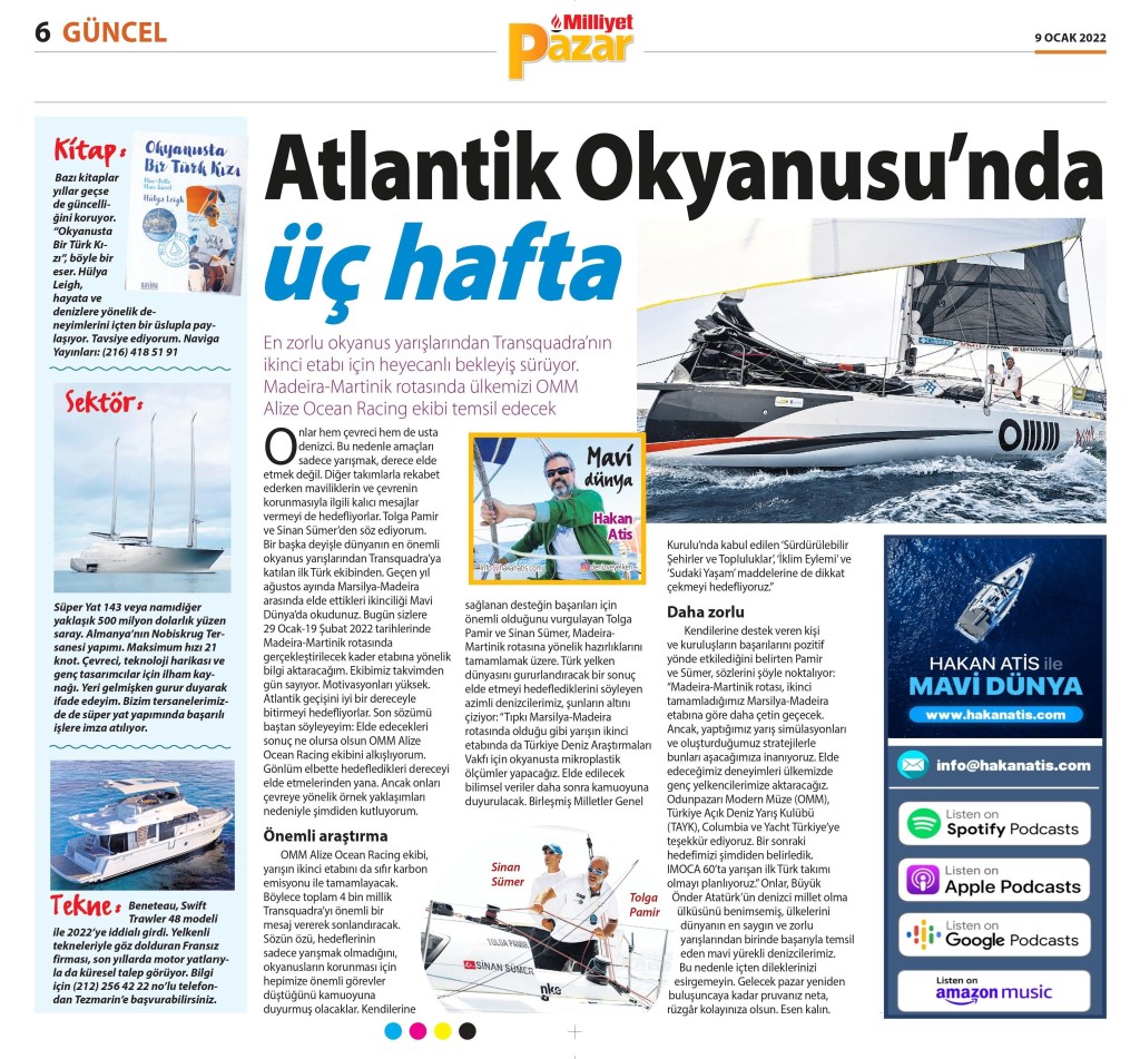 Geçtiğimiz yıl Ağustos ayında Marsilya-Madeira arasında elde ettikleri ikinciliği Mavi Dünya’da okudunuz. Bugün sizlere 29 Ocak-19 Şubat 2022 tarihlerinde Madeira-Martinik rotasında gerçekleştirilecek kader etabına yönelik bilgiler aktaracağım. Ekibimiz takvimden gün sayıyor. Motivasyonları oldukça yüksek. Atlantik geçişini iyi bir dereceyle bitirmeyi hedefliyorlar. Son sözümü baştan söyleyeyim. Elde edecekleri sonuç ne olursa olsun OMM Alize Ocean Racing ekibini alkışlıyorum. Gönlüm elbette hedefledikleri dereceyi elde etmelerinden yana. Ancak onları çevreye yönelik örnek yaklaşımları nedeniyle şimdiden kutluyorum.