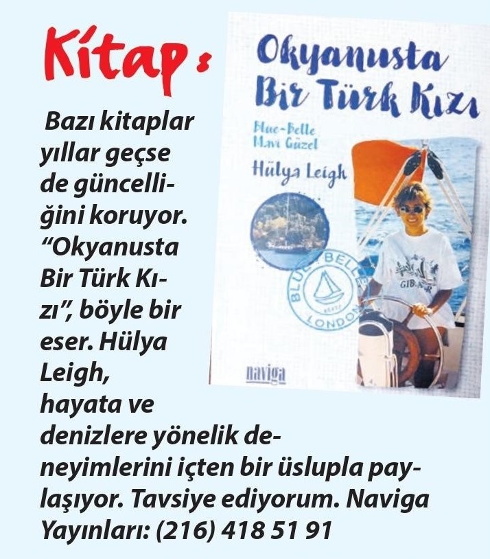 Bazı kitaplar yıllar geçse de güncelliğini koruyor. Okyanusta Bir Türk Kızı, böyle bir eser. Hülya Leigh, hayata ve denizlere yönelik deneyimlerini içten bir üslupla paylaşıyor. Tavsiye ediyorum. Naviga Yayınları: 216. 418 51 91