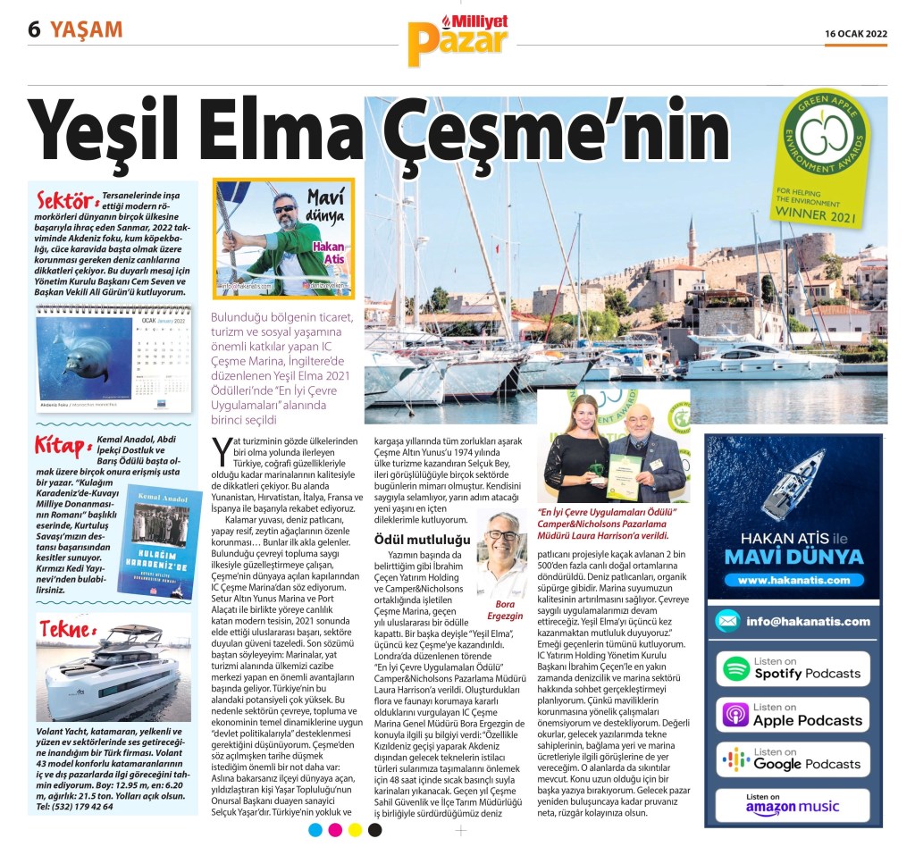 Bulunduğu bölgenin ticaret, turizm ve sosyal yaşamına önemli katkılar yapan IC Çeşme Marina, İngiltere’de düzenlenen Yeşil Elma 2021 Ödülleri’nde ‘En İyi Çevre Uygulamaları’ alanında birinci seçildi. Kalamar yuvası, deniz patlıcanı, yapay resif, zeytin ağaçlarının özenle korunması… Bunlar ilk akla gelenler. Bulunduğu çevreyi topluma saygı ilkesiyle güzelleştirmeye çalışan, Çeşme’nin dünyaya açılan kapılarından IC Çeşme Marina’dan söz ediyorum.