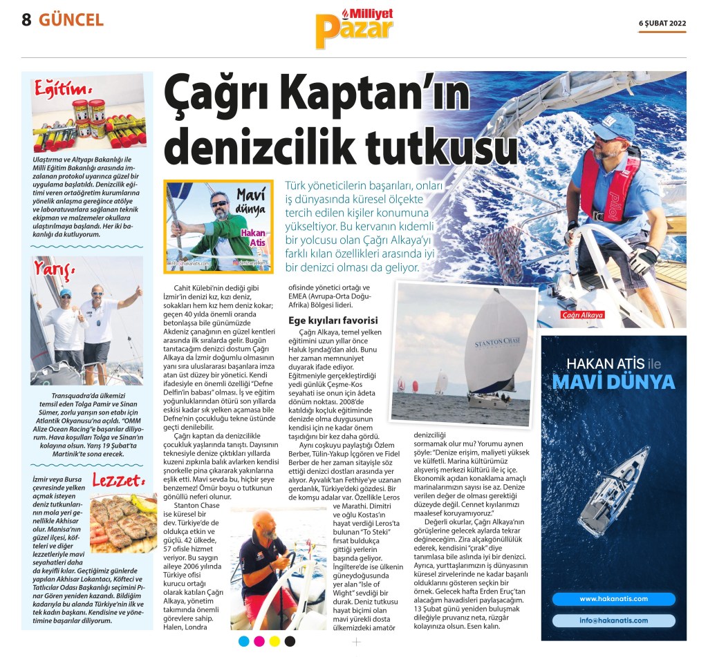 Stanton Chase’nin Avrupa, Orta Doğu ve Afrika Bölgeleri’nden sorumlu liderliğini yapan Çağrı Alkaya için deniz tutkusu farklı bir sevda. Şirketlere üst düzey yönetici arayan, araştırma ve danışmanlık alanlarında 42 ülkede 57 ofisle hizmet veren dünya devinin başarılı yöneticisi yaz aylarını iple çekiyor.