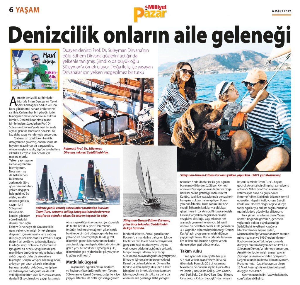 Türk şiirinin unutulmaz ismi Yahya Kemal’i Boğaz’da gezdiren, gencecik yaşlarında doktor olarak atandığı Seddülbahir’e yelkenli kayığıyla İstanbul’dan tek başına giden, Marmara’dan Ege’ye uzanan mavi rotanın mimarı sayılan ve 1950’lerden itibaren Bozburun’u önce Türkiye’ye sonra da dünyaya tanıtan duayen denizci Prof. Dr. Süleyman Dirvana’yı rahmetle anıyorum. Amatör denizcilerimizin annesi sayılan Zeynep Hanım’ın ellerinden öpüyorum. Değerli okurlar, bu haftalık noktalıyorum. Pruvanız neta, rüzgâr kolayınıza olsun. 13 Mart Pazar günü yeniden buluşmak dileğiyle esen kalın.