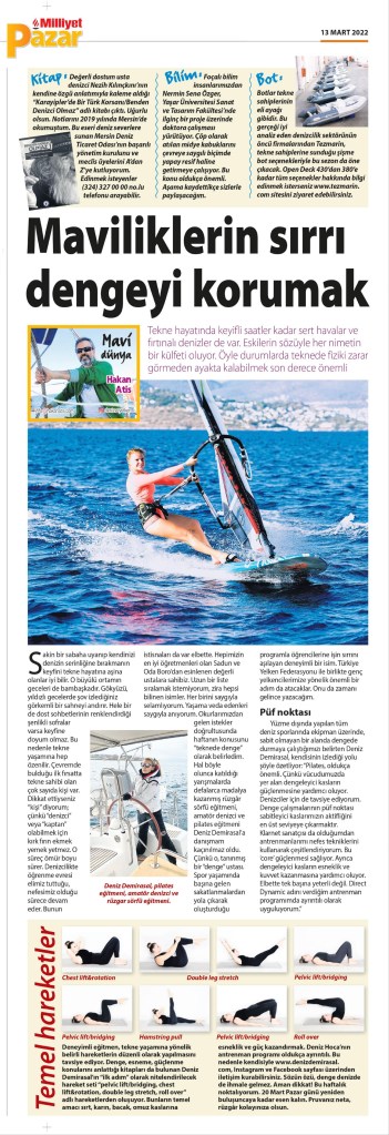 Deniz Hoca’nın antrenman programı oldukça ayrıntılı. Bu nedenle kendisiyle www.denizdemirasal.com, İnstagram denizdemirasal ve facebook sayfası üzerinden iletişim kurabilirsiniz. Google’a adını yazmanız yeterli olacaktır. Sözün özü, denge denizde de ihmale gelmez. Aman dikkat! Bu haftalık noktalıyorum. 20 Mart Pazar günü yeniden buluşuncaya kadar esen kalın. Pruvanız neta, rüzgar kolayınıza olsun.