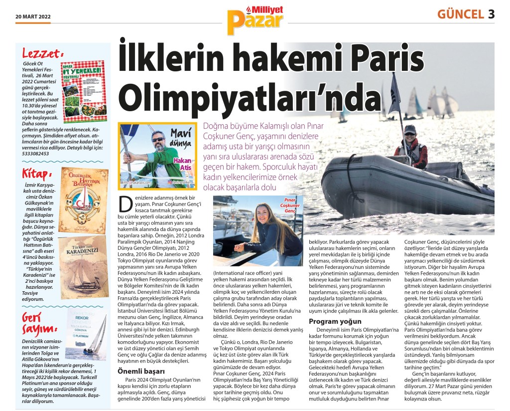 Diğer bir hayalim Avrupa Yelken Federasyonu’nun ilk kadın başkanı olmak. Benim yolumdan gitmek isteyen kadınların cinsiyetlerini ne artı ne de eksi olarak görmeleri gerek. Her türlü yarışta ve her türlü görevde yer alarak deyim yerindeyse sürekli olarak ders çalışmalılar. Önlerine çıkacak zorluklardan yılmamalılar. Çünkü hakemliğin cinsiyeti yoktur. Paris Olimpiyatları’nda bana görev verilmesini bekliyordum. Ancak Baş Yarış Sorumlusu yani Başhakemlerin Başhakemi olmak beklentimin üstündeydi. Yanlış bilmiyorsam ülkemizde olduğu gibi dünyada da spor tarihine geçtim. ’’ Pınar Coşkuner Genç’in başarılarını kutluyor, değerli ailesiyle birlikte maviliklerde esenlikler diliyorum. 27 Mart Pazar günü yeniden buluşmak üzere pruvanız neta, rüzgar kolayınıza olsun.