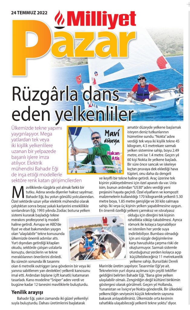 Bahadır Eği, yakın zamanda iki güzel yelkenliyi suyla buluşturdu. Dahası üretimlerini başlatarak amatör düzeyde yelkene başlamak isteyen deniz tutkunlarının hizmetine sundu. “Nokta” adını verdiği tek veya iki kişilik tekne 45 kilogram, 4.5 metrekare sarmalı yelken sistemine sahip, boyu 2.49 metre, eni ise 1.4 metre. Geçen yıl 60 kişi Nokta ile yelkene başladı. Bir süre önce sancak ve iskeleye kıçtan pruvaya dek eklediği hava tüpleri, onu daha da dengeli ve keyifli bir tekne haline getirdi. Araç üzerine tek kişinin yükleyebilmesi için özel aparatı da var. Usta isim, bunun ardından “U530” adını verdiği yeni projesini hayata geçirdi. Özel elyafların ve kompozit malzemelerin kullanıldığı 170 kilogramlık yelkenli 5.30 metre boya, 1.85 metre genişliğe ve 30 kilo salmaya sahip.