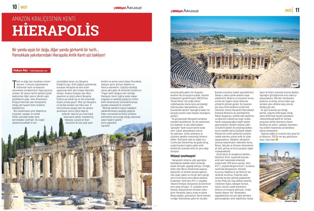 Mitolojik öykülerle toplum belleğinin şekillendirilmeye çalışıldığı çağlarda Helen, sonrasında ise Roma ve Bizans kültürlerinin ana kucağı olduğu savunulan sessiz taşların gizemli kenti, şaşkınlıkla hayranlık arasında gidip gelen tüm duyguları kendine has duruşuyla kucaklar. Amazon kraliçesinin görkemli kenti, Birleşmiş Milletler Eğitim, Bilim ve Kültür Örgütü UNESCO’nun ‘Dünya Mirası’ ilan ettiği mimari coğrafyasında özenle sarıp sarmaladığı tiyatrosundan nekropollerine, antik havuzlardan Apollon Tapınağı’na kadar her karışıyla asırlara nasıl meydan okuduğunu gösterir. İlk görüşünüzde Hierapolis’i kendinize mesafeli sanabilirsiniz. Bu sizi yanıltmasın. Onu keşfedin ve size adeta kalpten ‘günaydın’ diyen sıcacık sesine kulak verin. Çabuk sıkılacaksanız yoluna hiç sapmayın. Çünkü anlamanız ve çözmeniz gereken suskunluğu binlerce yıllıktır. Derinlerde saklı bu asalet onu cumhuriyet döneminde de gözde kılmış, araştırmacılara esin kaynağı olan antik kentlerimiz arasında farklı bir yere sahip olmuştur.