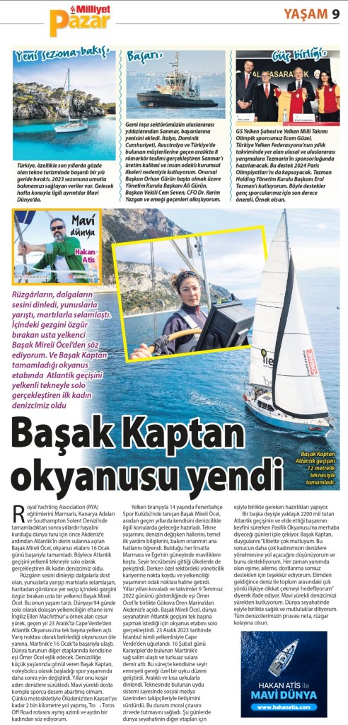 Rüzgarların sesini dinleyip dalgalarla dost olan, yunuslarla yarışıp martılarla selamlaşan, haritadan gönlünce yer seçip içindeki gezgini özgür bırakan usta bir yelkenci Başak Mireli Öcel. Bu onun yaşam tarzı. Dünyayı 94 günde solo olarak dolaşan yelkenciliğin efsane ismi İngiliz Ellen MacArthur’u örnek alan cesur yürek, 23 Aralık 2022 tarihinde Cape Verde’den Atlantik Okyanusu’na tek başına yelken açtı. Varış noktası olarak belirlediği okyanusun öte yanına, Martinik’e 16 Ocak 2023 tarihinde başarıyla ulaştı. Böylece Atlantik Okyanusu’nu yelkenli tekne ile tek başına geçen ilk Türk amatör kadın denizcisi unvanını elde etti. Dünya turunun diğer etaplarında kendisine eşi Ömer Öcel eşlik edecek. Denizciliğe küçük yaşlarında gönül veren Başak kaptan, voleybolcu olarak başladığı spor yaşamında daha sonra yön değiştirdi. Yıllar onu koşar adım denizlere sürükledi. Mavi yürekli dosta komple sporcu desem abartmış olmam. Çünkü motosikletiyle Ölüdeniz’den Kayseri’ye kadar 2 bin km yol yapmış, Trans Toros Off Road rotasını aşmış azimli ve aydın bir kadından söz ediyorum.