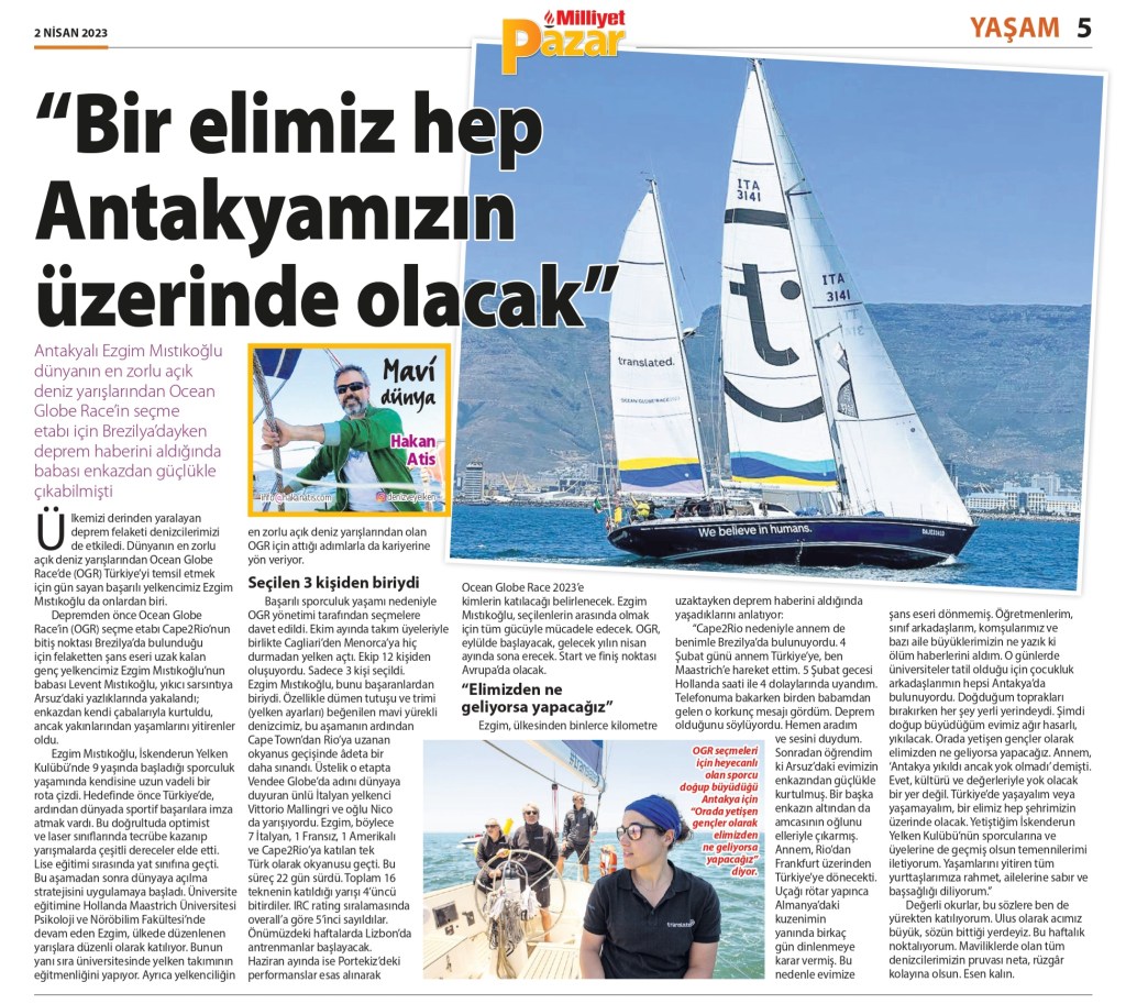 Deprem’den önce OGR’nin seçme etabı Cape2Rio’nun bitiş noktası Brezilya’da bulunduğu için felaketten şans eseri uzak kalan genç yelkencimizin babası, yıkıcı sarsıntıya Arsuz’daki yazlıklarında yakalandı. Levent Mıstıkoğlu, enkazdan kendi çabalarıyla kurtuldu. Ancak yakınlarından yaşamlarını yitirenler oldu.