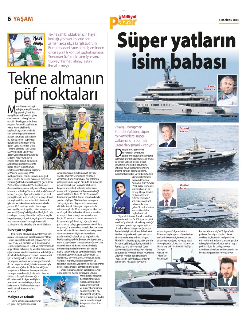 Peki, tekne almayı düşünenler veya yeni alanlar için konunun incelikleri nedir? Ufuk Timur, şu noktalara dikkati çekiyor: “Deniz suyu tekneleri, cihazları ve sistemleri ciddi şekilde yıpratır. Marin işçilik ve malzemeler de nispi olarak pahalıdır. Bu yüzden tekne alıcıları eğer konuya akademik anlamda vakıf değilse ileride daha fazla para ve vakit harcamamak için yetkinliğinden emin oldukları bir surveyora, mutlaka inceletme yaptırmalıdır. Bu tarz raporlar alıcı için bakım maksadıyla dikkate alacağı kontrol listesi niteliği de taşıyacaktır. Tekne alıcıları veya sahipleri surveyor seçerken ölçümlerinde cihaz ve sistem kullanıp kullanmadığına dikkat etmelidir. Ayrıca o kişinin akademik ve mesleki geçmişine bakılmalıdır. IIMS üyesi surveyor tercih etmek kanımca daha yararlıdır.”