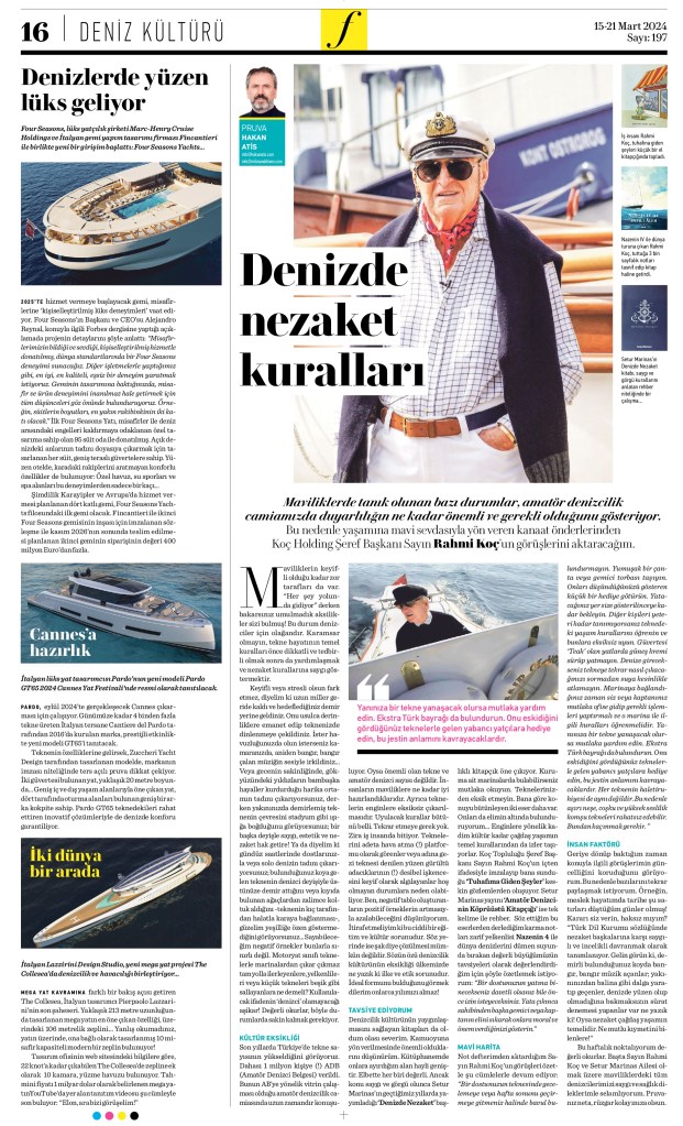 Oysa nezaket çağdaş yaşamın temelidir. Ne mutlu kıymetini bilenlere!’’ Bu haftalık noktalıyorum değerli okurlar. Başta Sayın Rahmi Koç ve Setur Marinas Ailesi olmak üzere maviliklerdeki tüm denizcilerimizi saygı ve sağlık dileklerimle selamlıyorum.