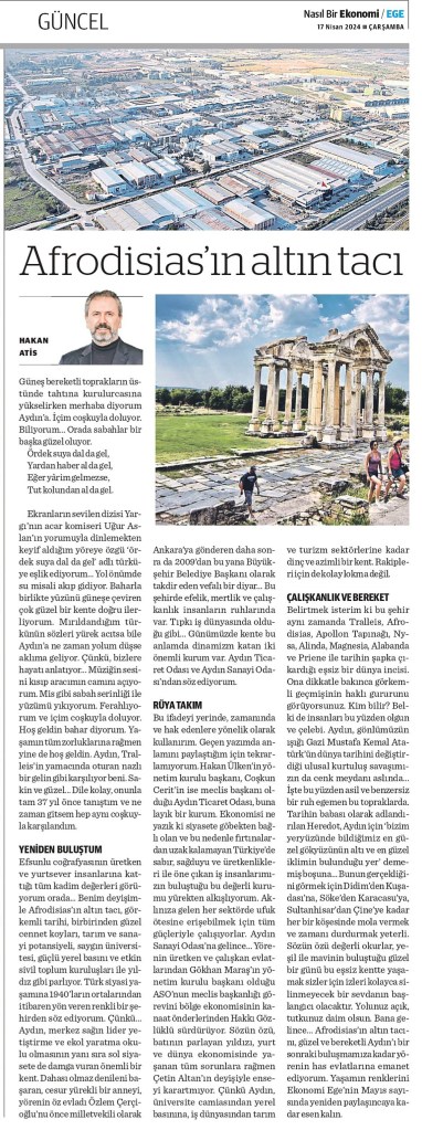 Tarihin babası olarak adlandırılan Heredot, Aydın için ‘Bizim yeryüzünde bildiğimiz en güzel gökyüzünün altı ve en güzel iklimin bulunduğu yer’ dememiş boşuna… Bunun gerçekliğini görmek için Didim’den Kuşadası’na, Söke’den Karacasu’ya, Sultanhisar’dan Çine’ye kadar her bir köşesinde mola vermek ve zamanı durdurmak yeterli. Sözün özü değerli okurlar, yeşil ile mavinin buluştuğu güzel bir günü bu eşsiz kentte yaşamak sizler için izleri kolayca silinmeyecek bir sevdanın başlangıcı olacaktır. Yolunuz açık, tutkunuz daim olsun. Bana gelince… Afrodisias’ın altın tacını, güzel ve bereketli Aydın’ı bir sonra ki buluşmamıza kadar yörenin has evlatlarına emanet ediyorum. Yaşamın renklerini Ekonomi Ege’nin Mayıs sayısında yeniden paylaşıncaya kadar esen kalın.