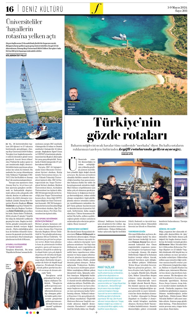 Yelkenli teknesi Kayıtsız 3 ile gerçekleştirdiği dünya seyahatini ‘Özgürlük Hattının Batısına’ başlıklı eserinde aktaran değerli denizcimizin Karadeniz’i anlattığı özel bir kitabı daha var. Keşfedilmeyi bekleyen kıyılarımız için yol gösterici bir rehber. www.kayitsiz.com üzerinden temin edinebilirsiniz. Özkan Gülkaynak, bahar aylarında Ege’de özellikle Dikili Bademli ve Ayvalık koylarını tavsiye ediyor. Güneydeki favorisi ise Göcek ve Hisarönü.