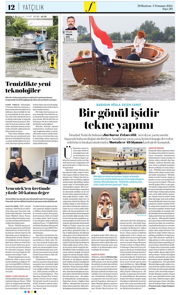 Günümüzde özellikle ahşap tekne konusunda imalat yapan birçok kaliteli ve köklü firmaya sahibiz. Bunun değerini bilmek gerekiyor.’’ Sözün özü değerli okurlar, marinalarda veya seyirde görenlerin hayran kaldığı tekneler yapabiliyoruz. Yurt genelinde Mustafa Şişman gibi yüzlerce kanaat önderine sahibiz. Onların her biri bizim için ekonomik milli güç unsuru. Azim, kararlılık ve başarılarıyla dünyaya meydan okuyan tüm mavi yüreklilerimizin yolu açık olsun. Sektörün başarı öyküsünü yazmaya devam edeceğim. Gelecek haftaya kadar esen kalın. Pruvanız neta, rüzgar kolayınıza olsun.