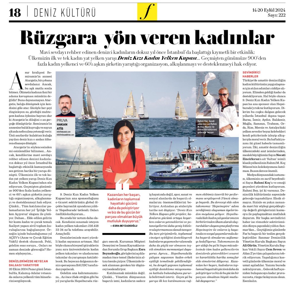 9. Deniz Kızı Kadın Yelken Kupası’nın ana sponsorluğunu e-ticaret sektörünün global ölçekte hayranlık uyandıran yıldızı ‘Hepsiburada’ üstlendi. Onları özellikle kutluyorum… Bu arada bir notum daha olacak. Kendisini sınamak isteyen kadın yelken takımları 216.418 33 34 no’lu telefonu arayabilir. Amaç belli… Denizlerimizde mavi yürekli kadın sayısının artması. Hal böyle olunca bireysel iştiraklerin yanı sıra üniversitelerin kadın yelken takımları ve uluslararası takımlar da yarışmaya katılabilecek. Bu heyecan dalgasının deniz operasyonu BAUISC tarafından yapılacak. Gelelim ana kahramanımıza… Az önce ifade ettiğim gibi bu yıl Hepsiburada rüzgarı esecek.