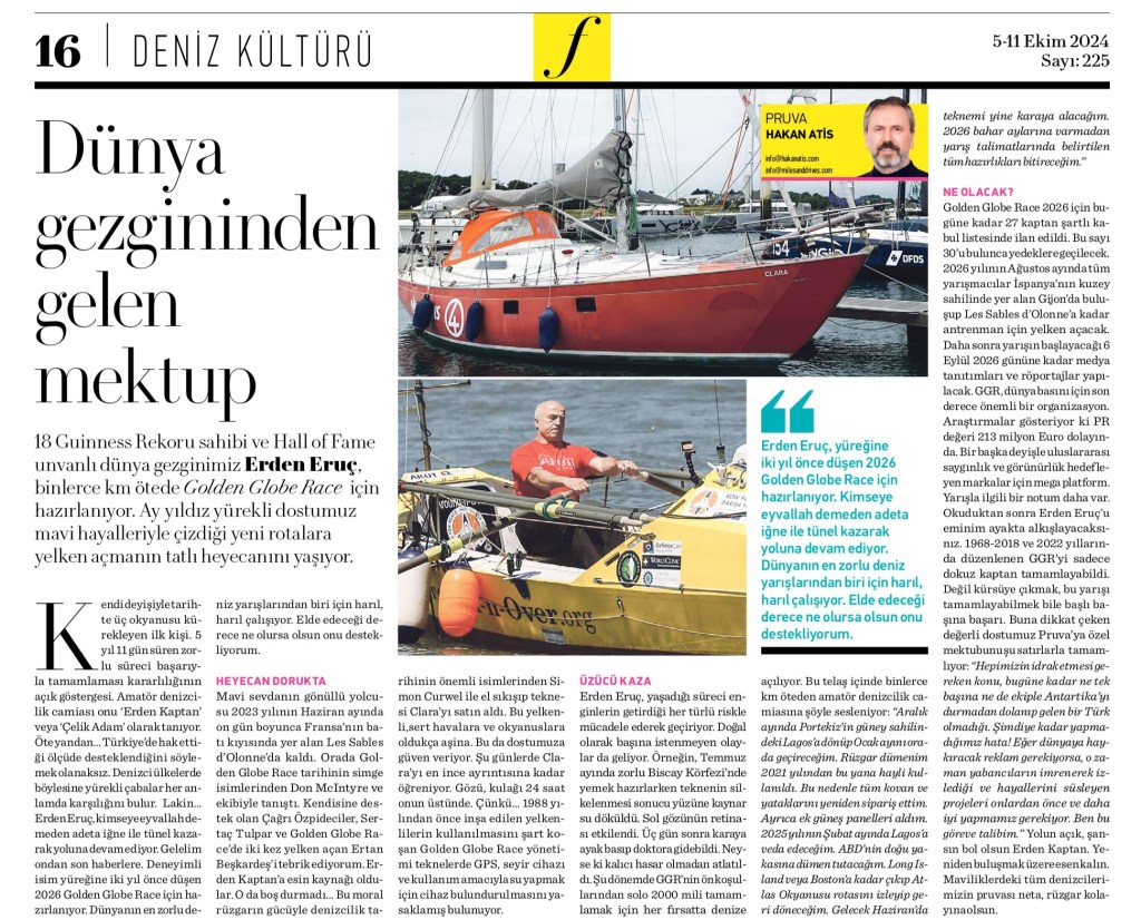 Mavi sevdanın gönüllü yolcusu 2023 yılının Haziran ayında on gün boyunca Fransa’nın batı kıyısında yer alan Les Sables d’Olonne’da kaldı. Orada Golden Globe Race tarihinin simge isimlerinden Don McIntyre ve ekibiyle tanıştı. Kendisine destek olan Çağrı Özpideciler, Sertaç Tulpar ve Golden Globe Race’de iki kez yelken açan Ertan Beşkardeş’i tebrik ediyorum.