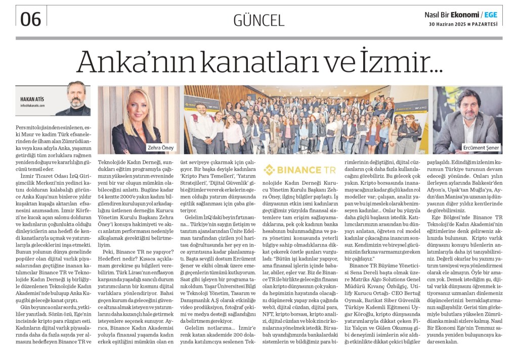 İzmir Körfezi’ne bakan salonda, çoğunluğu kadınlardan oluşan dinleyicilerin ortak hedefi, kendi kanatlarıyla uçmak ve yatırımlarıyla geleceklerini inşa etmekti. Bu hedefin, dünya genelinde popüler olan dijital varlık piyasalarıyla mümkün olduğuna inanan katılımcılar, Binance TR ve Teknolojide Kadın Derneği iş birliğiyle düzenlenen Teknolojide Kadın Akademisi’nde bir araya geldiler. Gün boyunca onlar sordu, yetkililer yanıtladı. Sözün özü, Ege’nin incisinde kripto para rüzgarı esti.
